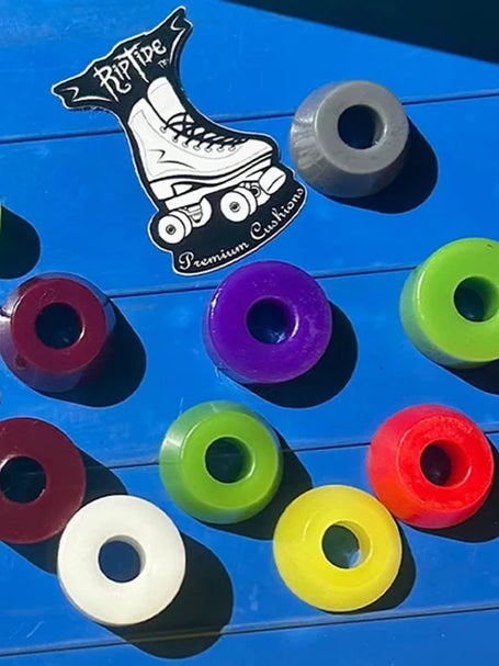 RipTide Reactor Skate Cushions are a full set of replacement cushions for PowerDyne Reactor Fuse, Neo, and Pro Plates, as well as RD Elite Pro Octane and Axis 45 Plates. Each set includes four 0.50" step cones, four 0.55" barrels, and four washers that fit over flared kingpins.